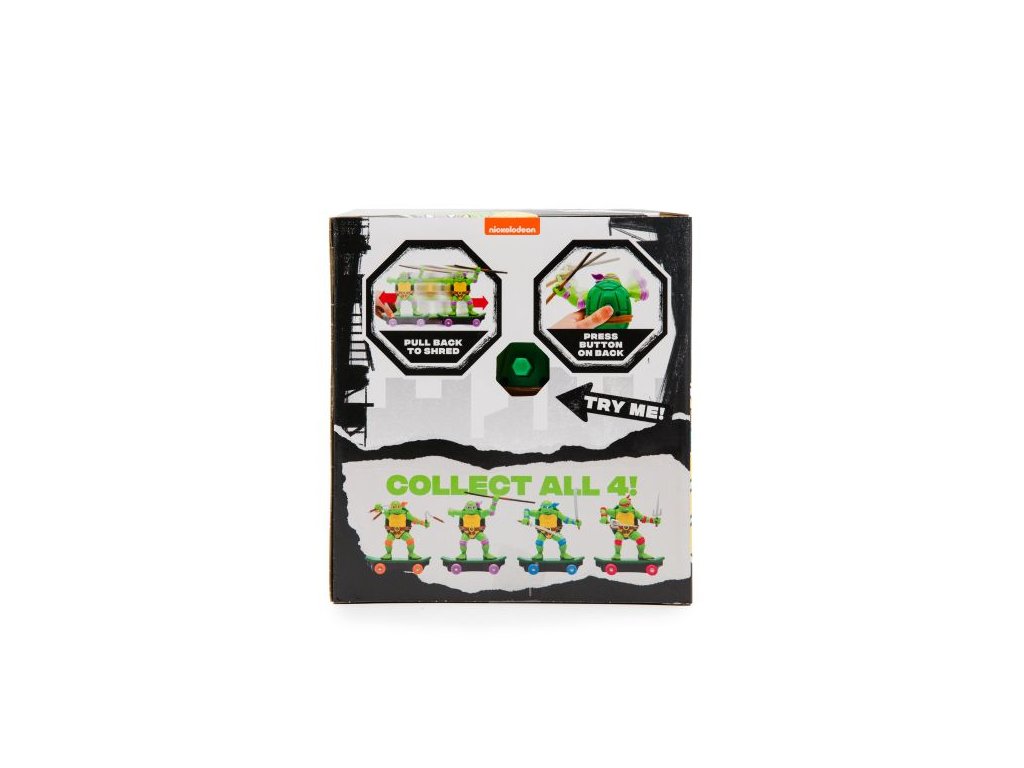 The Teenage Mutant Ninja Turtles jsou cca 13 cm velké želvy na skatech připraveny na boj. Mají typický design oblíbených želv Ninja, které drží svoji ikonickou zbraň. Zatáhněte želvu Ninja dozadu, pusťte ji a sledujte, jak jezdí! Stisknutím tlačítka na krunýři spustíte bojový režim! Nasbírejte všechny 4 postavy - Leonardo, Michelangelo, Donatello a Raphaelo! Vhodné pro děti od 3 let.Doplňkové parametry