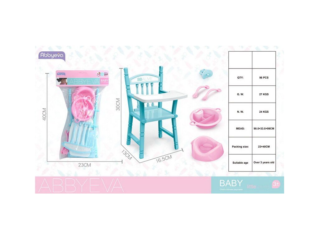 Židle skládací pro miminko s doplňky. Rozměry židle 16,5x13x30 cm. Součástí židle, nočník, miska, lžíce, vidlička, dudlík. Pro děti od 3 let.Doplňkové parametry