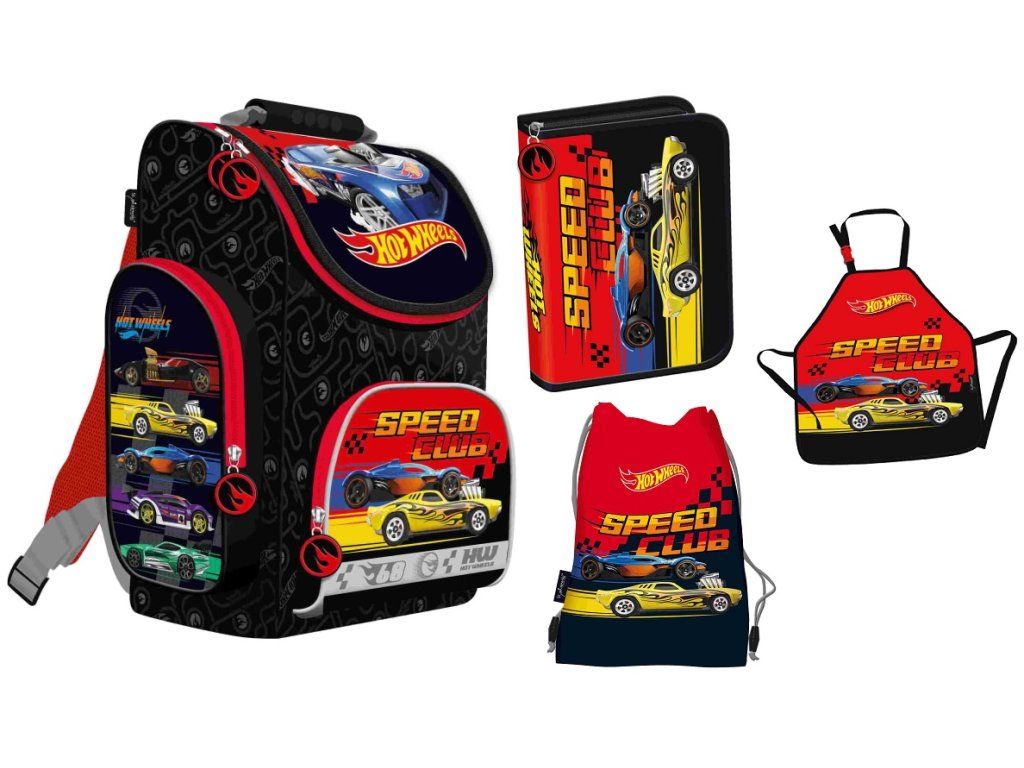 Zvýhodněná školní sada s motivem Hot Wheels obsahuje 5 kusy - školní egronomický batoh - aktovku, sáček na přezůvky,dvoupatrový penál vybavený, pastelky