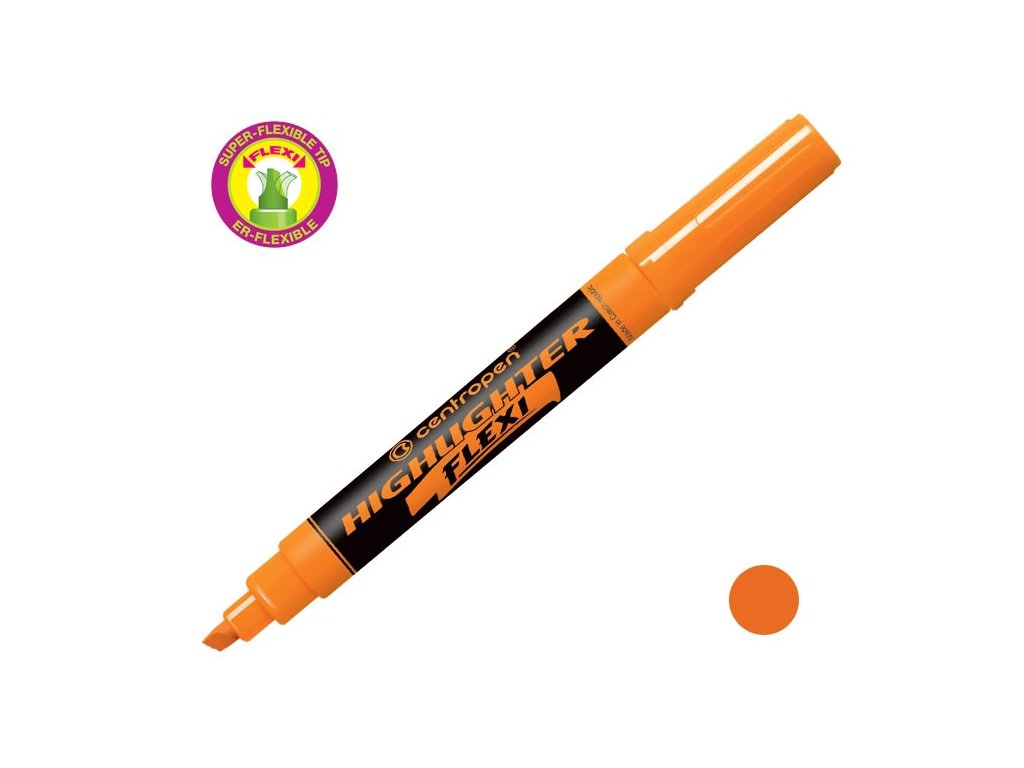 Zvýrazňovač Centropen 8542 Flexi oranžové barvy. Velkokapacitní zvýrazňovač se super pružným hrotem a fluorescenčním pigmentovým inkoustem, který je odolný vůči UV záření. Klínový hrot s šířkou stopy 1 - 5 mm. Určený pro rychlé, hladké a pohodlné zvýraznění textu na veškerých druzích papírů.Doplňkové parametry