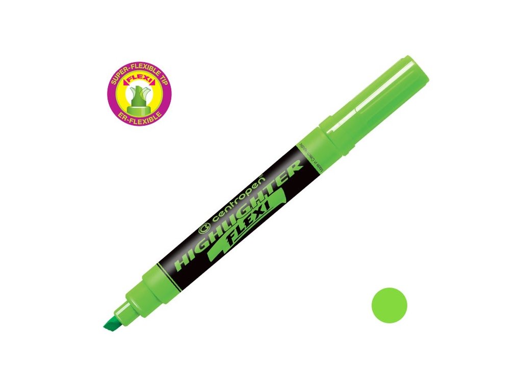 Zvýrazňovač Centropen 8542 Flexi zelené barvy. Velkokapacitní zvýrazňovač se super pružným hrotem a fluorescenčním pigmentovým inkoustem, který je odolný vůči UV záření. Klínový hrot s šířkou stopy 1 - 5 mm. Určený pro rychlé, hladké a pohodlné zvýraznění textu na veškerých druzích papírů.Doplňkové parametry