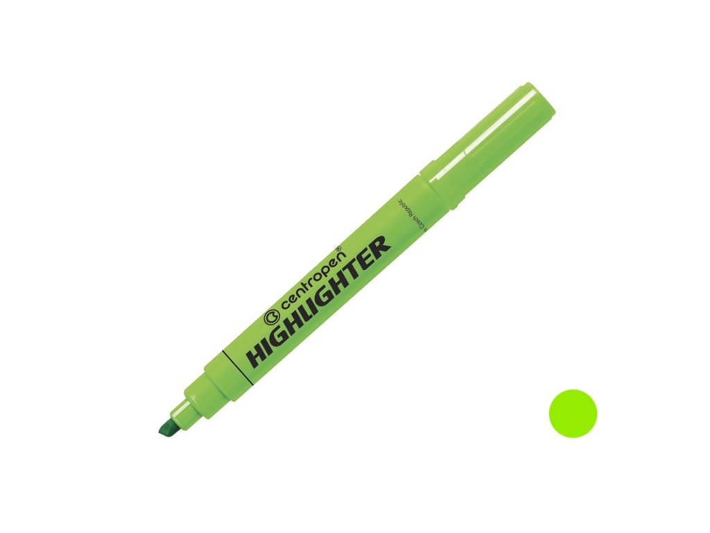 Zvýrazňovač Centropen 8552 zelené barvy. Velkokapacitní zvýrazňovač s reflexním, světlostálým pigmentovým inkoustem. Klínový hrot s šířkou stopy 1 - 4,6mm. Určený pro zvýrazňování textů na všech druzích papíru včetně faxového a samokopírovacího. Ventilační chránítko.Doplňkové parametry