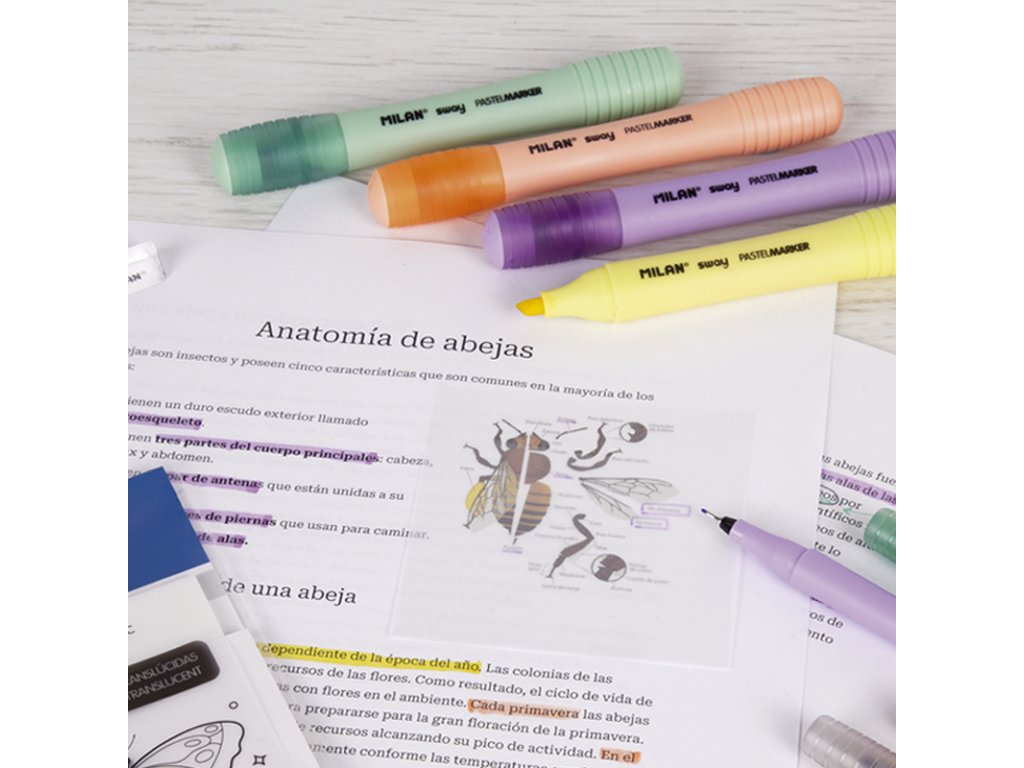 Pastelový barevný zvýrazňovač. Originální design SWAY Milan. Klínový hrot, šíře stopy 2 - 4 mm. Ideální na zdůraznění a zvýraznění všech druzích papíru. Zvýrazňovače jsou v praktickém plastovém obalu, který slouží jako stojánek.Doplňkové parametry