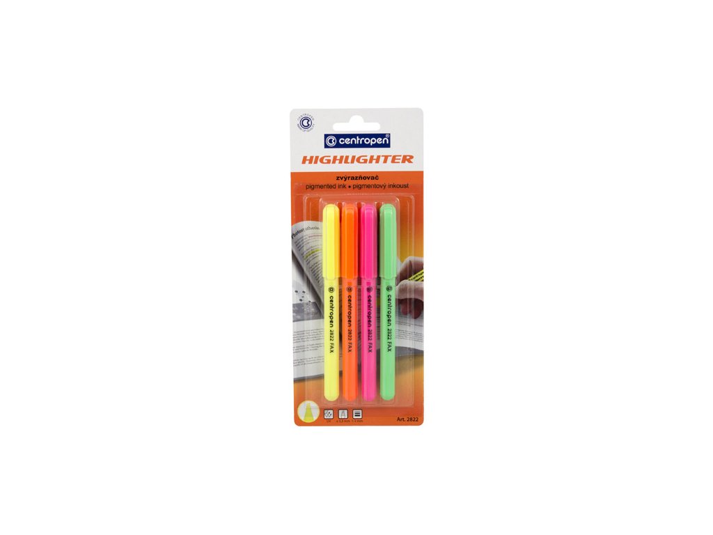 Zvýrazňovač Centropen 2822/4 BL praktické provedení oblíbených zvýrazňovačů. Zvýrazňovač je osazen klínovým hrotem, který vytvoří stopu písma šíře 1 - 3 mm, je plněn fluorescenčním inkoustem vhodným nejen na všechny druhy běžných papírů, ale i na papíry kopírovací a faxové. Uzávěr je vybaven praktickou klipsnou, odolnost zvýrazňovačů proti vyschnutí je min. 3 roky.Doplňkové parametry