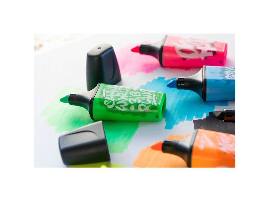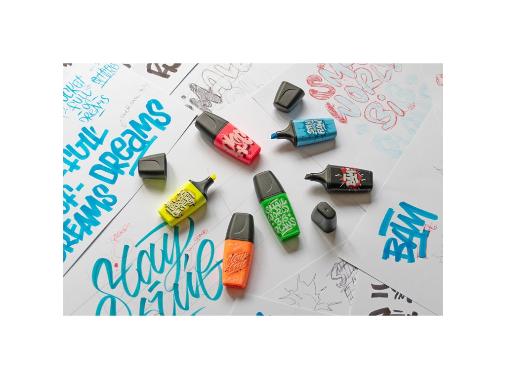 Mini zvýrazňovače s potlačou trendových motívov, ktorý navrhol mladý berlínsky umelec Snooze One.
