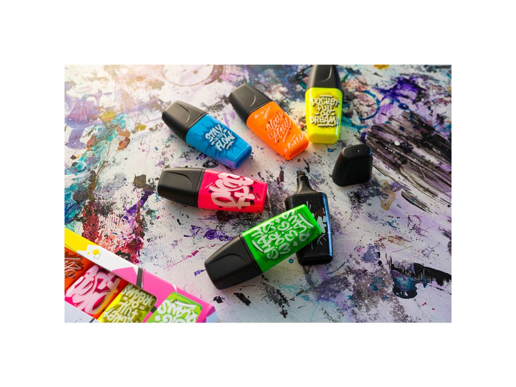 Mini zvýrazňovače s potlačou trendových motívov, ktorý navrhol mladý berlínsky umelec Snooze One.