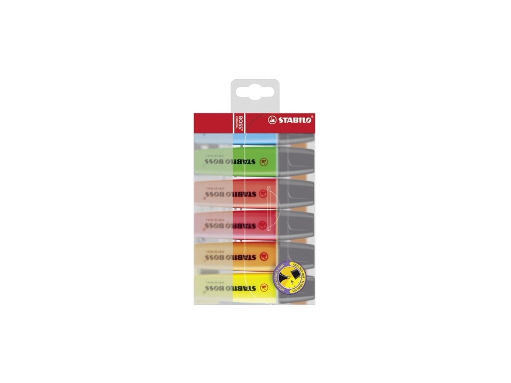 Zvýrazňovač pro všechny, kteří se při čtení potřebují soustředit na to podstatné. Produkt STABILO BOSS ORIGINAL nabízí nejvyšší kvalitu zpracování, inkoustu a pohodlí při psaní. Technologie STABILO Anti-Dry-Out chrání čtyři hodiny před vyschnutím. Zvýrazňovač je možné doplnit náplněmi STABILO BOSS. Sada 6 ks - pastelová žlutá, broskvová, růžová, fialová, mátová a tyrkysová barva.Doplňkové parametry