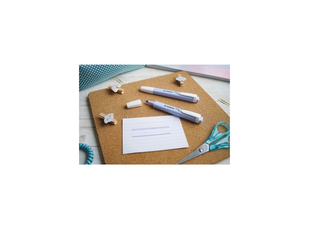 Trendový zvýrazňovač použitého si třeba vzít s sebou, to je STABILO swing cool pastel. Pro všechny, kteří chtějí na cestách zvýraznit a hrát s pastelovými a jemnými barvami, je swing cool v obláčkově modré barvě dokonalým řešením. Technologie STABILO Anti-Dry-Out poskytuje 4 hodinovou ochranu před vyschnutím a umožňuje soustředěnou práci. Díky praktickému klipu a tenkému tvaru je dokonalým společníkem na cestách.Doplňkové parametry